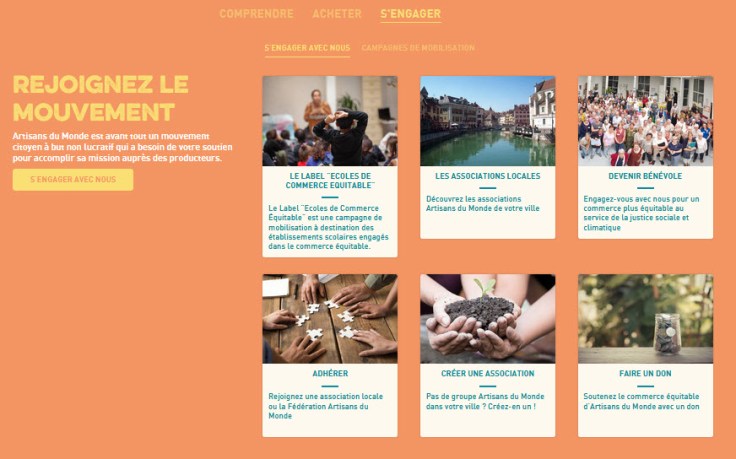 On lance une grande campagne, ludique, positive et engageante pour vous faire découvrir le visage d’Artisans du Monde, celui des bénévoles et des partenaires qui font vivre, chaque jour, notre mouvement. Parce que les actes valent plus que les grands discours, nous vous invitons à découvrir ces milliers de personnes qui “font” et à les rejoindre… et parce que pour nous, engagement rime avec convivialité, nous avons préparé des surprises tout au long de l’année : jeux concours, événements, et bien d’autres choses encore !